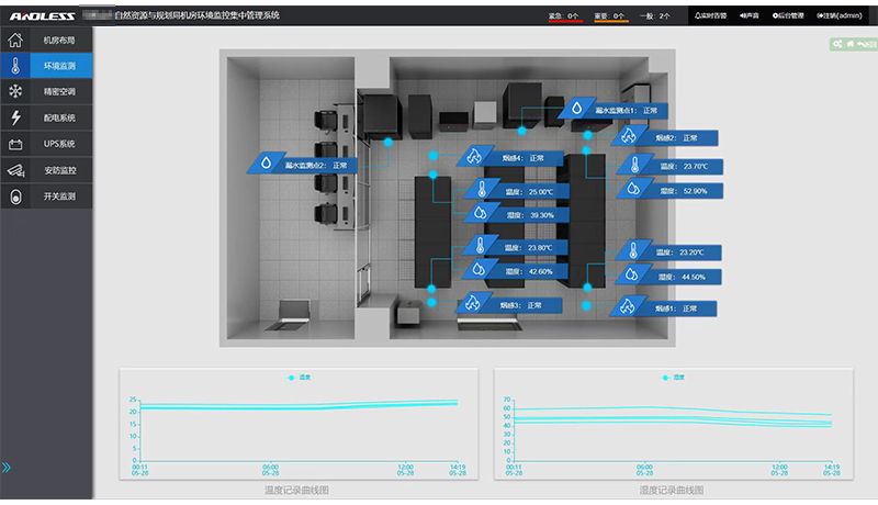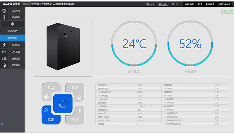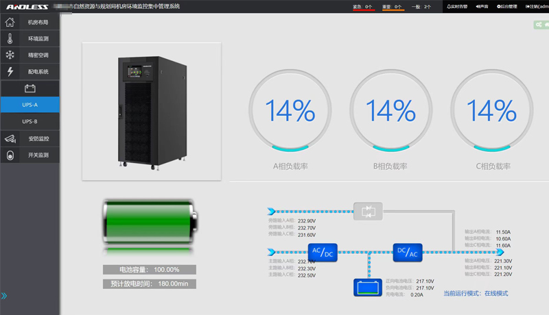 我司近期為安徽省某市自然資源和規(guī)劃局機(jī)房的UPS進(jìn)行更換,本次更換了安德力士品牌模塊化UPS主機(jī)一臺(tái)(120KVA容量),并為其機(jī)房配置了一套動(dòng)力環(huán)境監(jiān)控系統(tǒng),本套動(dòng)力環(huán)境監(jiān)控系統(tǒng)主要是對(duì)機(jī)房?jī)?nèi)的空調(diào)、門禁、監(jiān)控進(jìn)行監(jiān)測(cè)。